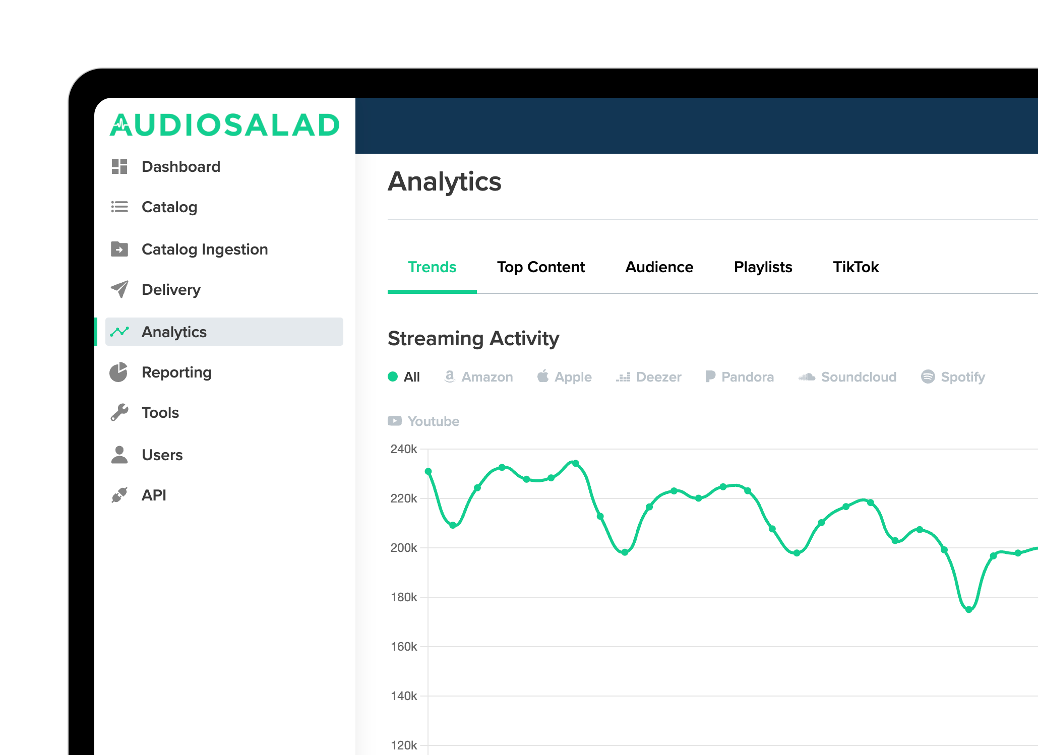 AudioSalad ensures your music reaches audiences worldwide by delivering to leading platforms like Spotify, Apple Music, YouTube, and more. Built to meet the ever-changing requirements of global DSPs, your releases arrive on time, every time.