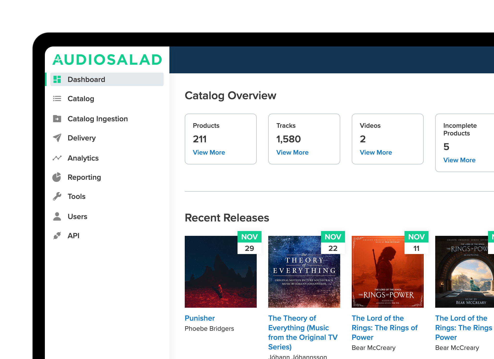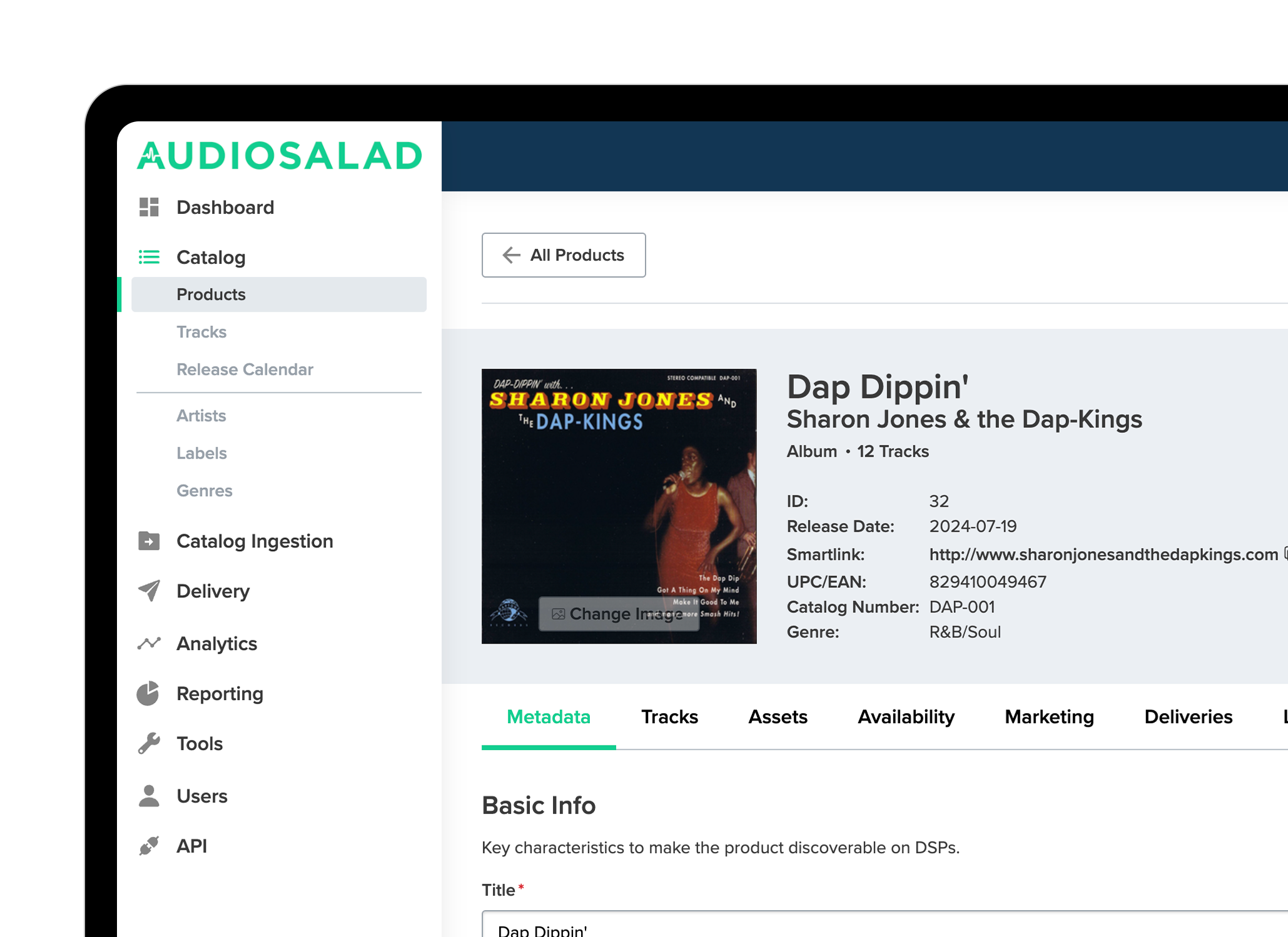 AudioSalad equips music professionals with the tools to manage their catalogs and deliver worldwide—seamlessly and at scale. Backed by some of the biggest names in independent music, our platform helps you reach more listeners, grow revenue, improve operations.